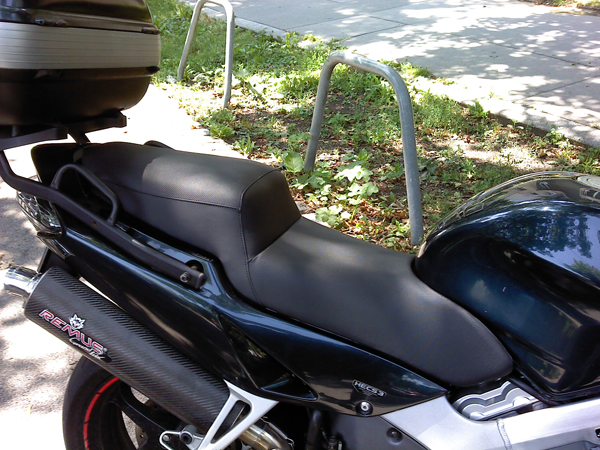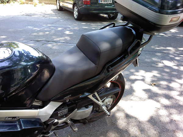 ...naja bis zwergerl probegesessen ist. das topcase schliesst ziemlich bündig mit dem soziussitz ab. leider ist aber dieser ein wenig zu kurz und zu schräg um bequem sitzen zu können, ohne dass man das gefühl hat nach vorne zu rutschen. ich habs auch ausprobiert - sitzt sich scheisse. vor allem ohne die serienmäßigen haltegriffe hat man keine möglichkeit sich beim anbremsen abzustützen. mit den beinen geht des auch net wirklich, da die fussrasten weiter hinten sind als bei der seven.